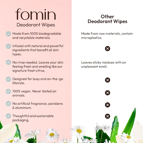 Introducing FOMIN Deodorant Wipes, the perfect solution for staying fresh and odor-free on the go. Our variety pack includes 50 individually wrapped wipes, making it easy to toss one in your purse, gym bag, or travel carry-on. The eco-friendly formula is gentle on sensitive skin and provides long-lasting protection against sweat and odors. These mini deodorant wipes are perfect for women who are always on the move and need a quick and convenient way to freshen up. Say goodbye to messy, bulky deodorant sticks and hello to the ease and portability of FOMIN Deodorant Wipes. Keep yourself feeling confident and clean no matter where your day takes you. Try FOMIN Deodorant Wipes today and experience the convenience of on-the-go freshness.,